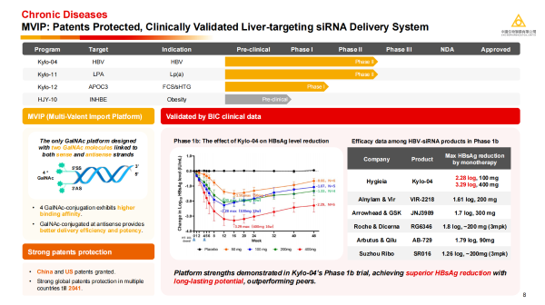 ·Kylo-04:基于MVIP平台开发的Kylo-04在乙肝(HBV)治疗的Ib期临床试验中,取得了优于同行的HBsAg(乙肝表面抗原)降低效果,400mg剂量组降幅高达3.29log,展现出卓越的疗效和持久性以及MVIP平台高效的递送效率。