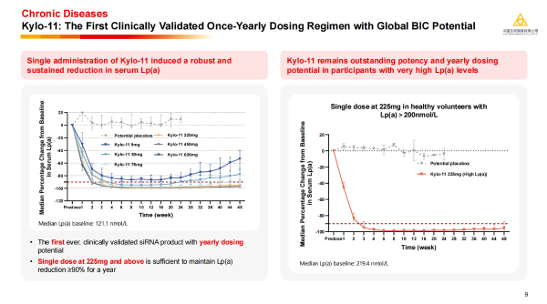 ·Kylo-11:基于该平台开发的治疗高Lp(a)血症的小核酸产品Kylo-11,临床研究数据显示单次给药225mg,即可诱导血清Lp(a)水平降低超过90%,效果持续时间长达一年;即使在基线Lp(a)水平极高的受试者中,Kylo-11依然能实现并维持约90%的降幅,展现了全球同类最佳(BIC)的潜力,有望为心血管疾病的预防和治疗带来革命性改变。