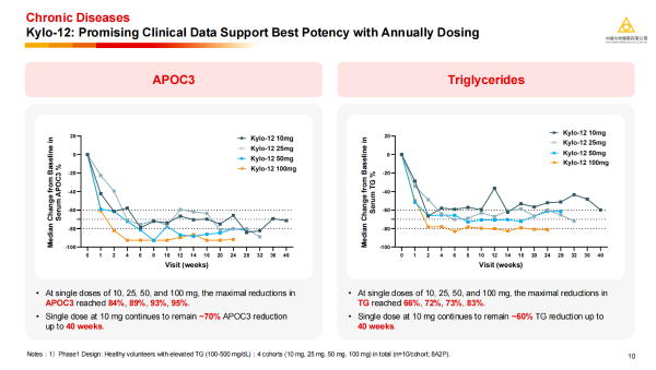 ·Kylo-12:基于该平台开发靶向APOC3的Kylo-12,在针对高甘油三酯血症(sHTG)的治疗中也显示出强大的临床潜力,单次给药10mg即可在40周后仍维持约70%的APOC3和约60%的甘油三酯(TG)降幅,且疗效呈现显著剂量依赖性,预示其同样具备一年给药一次即可实现显著获益的潜力。