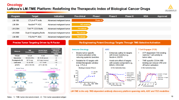 秦莹介绍,礼新医药的核心竞争力在于其独特的LM-TME平台。该平台旨在解决肿瘤生物药领域一个根本性挑战:如何在保持强效杀伤的同时,降低系统性毒性。LM-TME平台利用肿瘤组织中某些生化因子(R因子)浓度远高于正常组织的特性,设计出TME选择性激活的抗体药物,进而“重新盘活”CTLA-4等历史上因毒性受限的靶点。并且,LM-TME是目前已知唯一涵盖单克隆抗体(mAb)、抗体药物偶联物(ADC)和T细胞衔接器(TCE)三种药物形式的TME依赖性抗体发现平台,是一款用于开发差异性创新生物药的强大引擎。