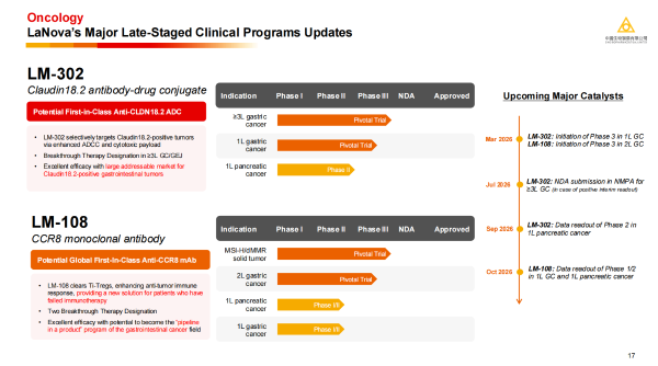 ·LM-302:一款具备全球同类首创(FIC)潜力的CLDN18.2 ADC,已获用于治疗晚期或转移性胃及胃食管交界部腺癌的突破性疗法认定。LM-302计划于2026年3月启动一线胃癌的Ⅲ期临床,并有望于2026年中期向国家药品监督管理局(NMPA)提交用于三线及以上胃癌适应症的上市申请,一线治疗胰腺癌的最新研究数据预计在今年读出。