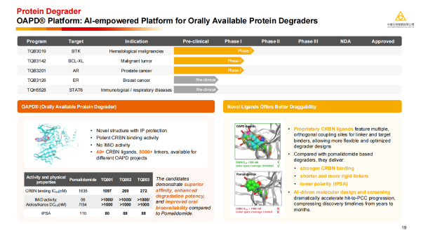 除了通过并购实现跨越式发展,钱柜777制药同样展示了强大的内生研发实力。公司重点介绍了在AI辅助小分子药物和OAPD®(口服蛋白降解剂)药物发现平台的最新进展。