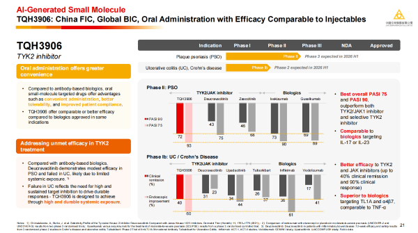·TQH3906:新一代口服TYK2抑制剂,在斑块型银屑病的Ⅱ期研究中,PASI-75和PASI-90应答率分别高达93%和72%,媲美生物制剂;在溃疡性结肠炎的Ⅰb期数据中,展现出40%的临床缓解率,超同类药物。公司计划与2026年上半年启动与现有TYK2抑制剂“头对头”治疗银屑病的Ⅲ期研究,用于溃疡性结肠炎的Ⅱ期研究也将同期开展。